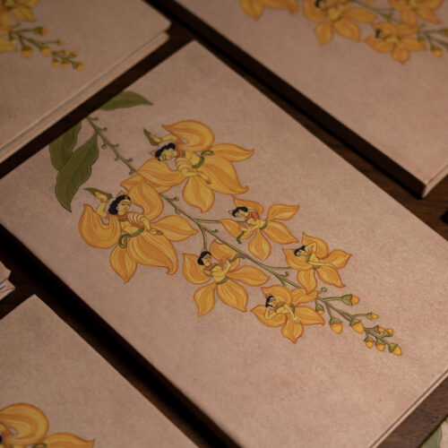 From a cascading spray of amaltas, spring appears to learn its dance. Each golden blossom unfurls into the figure of a young dancer-her form born of petals, her yellow drapes flowing like sunlight held in motion. Rooted in the lyricism of Santiniketan, the work carries the Ashram’s spirit, where nature and the human form do not stand apart but softly echo one another. In the jewel-like radiance of the amaltas, one glimpses the celebratory procession of Vasanta Utsav-a season embodied in colour, movement, and joy.