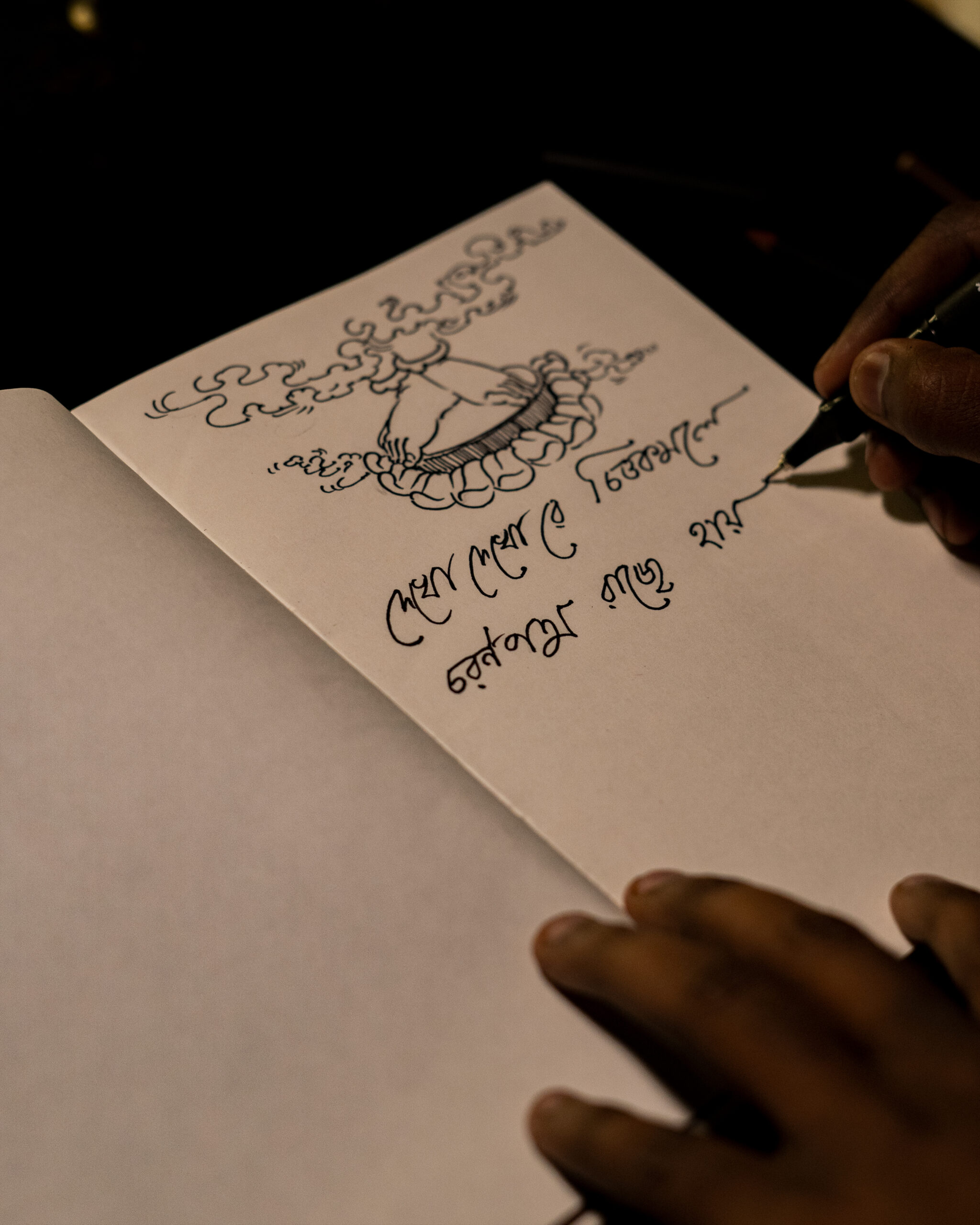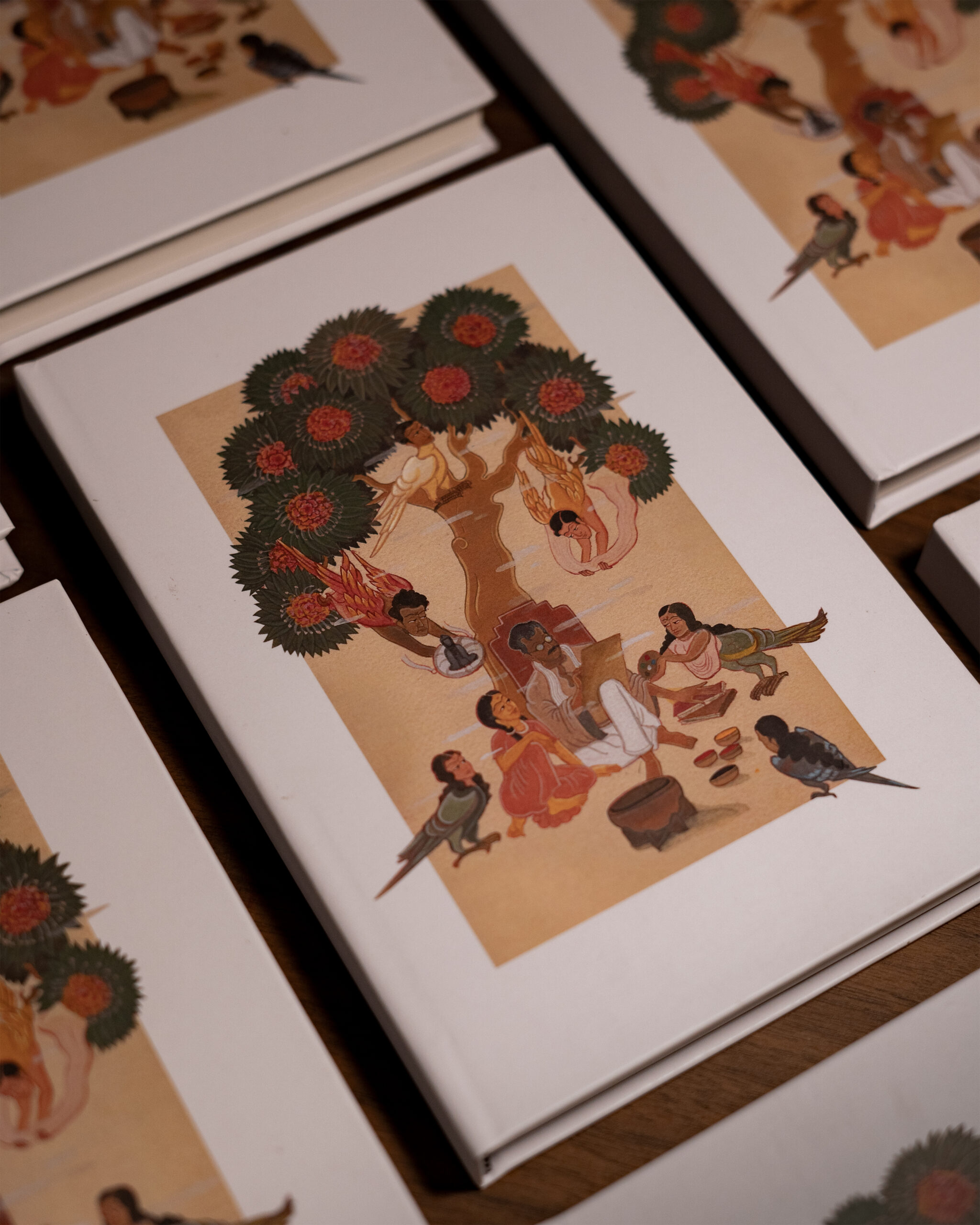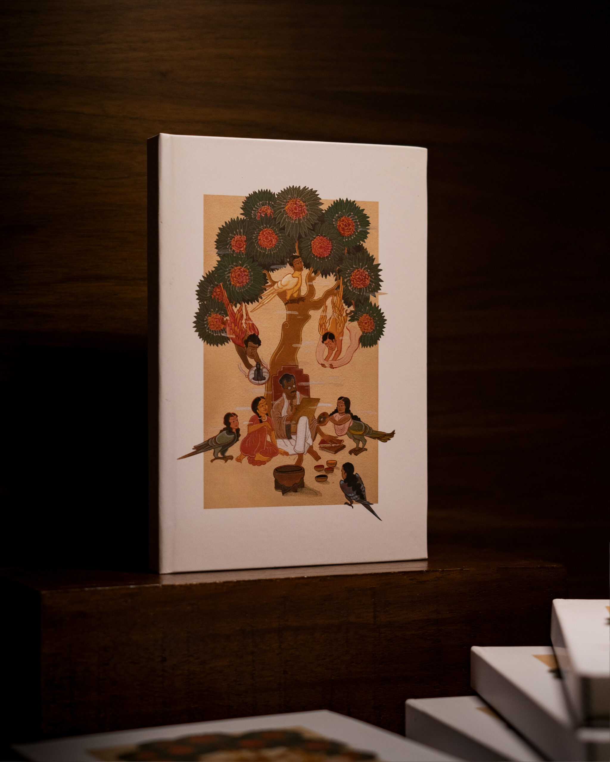 High in the branches rest Guru Abanindranath, Ramkinkar, and Asit, like guiding spirits of his tradition. Beside him his beloved daughters, Jamuna and Gouri hold the palette, helping him continue the act of creation. The tree becomes a living shrine where Santiniketan’s art turns into a path of liberation.