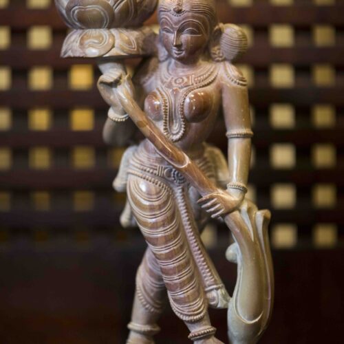 A picture of sensuous indolence, a petite celestial nymph or apsara holds a full-blown lotus in her lyrical stance. Depicted extensively in various Indian art forms, apsaras are believed to be beautiful celestial dancers and musicians who frequent water bodies and clouds.