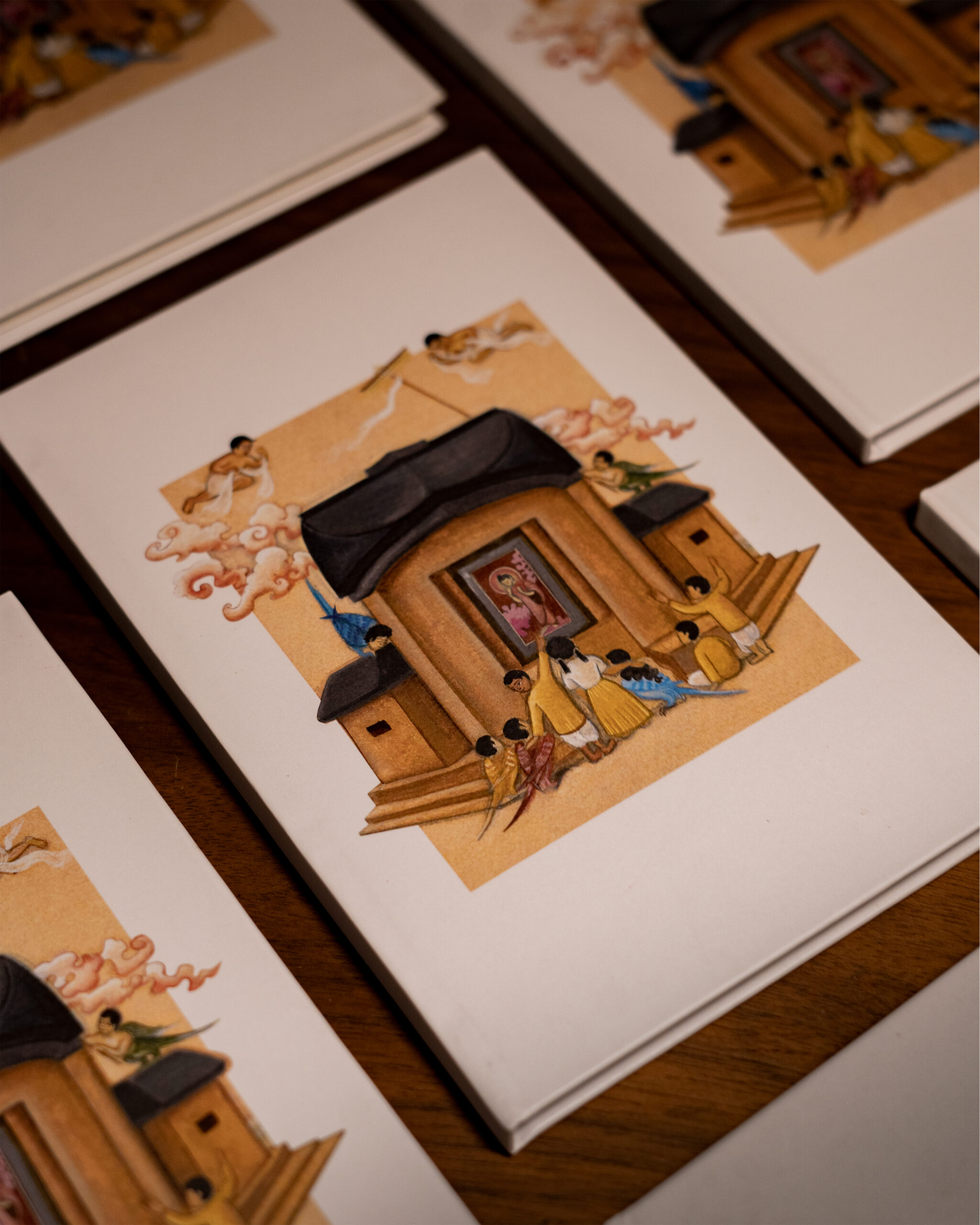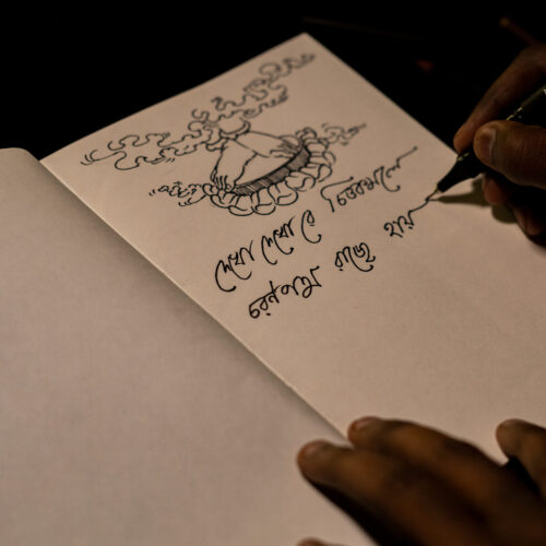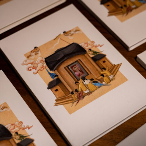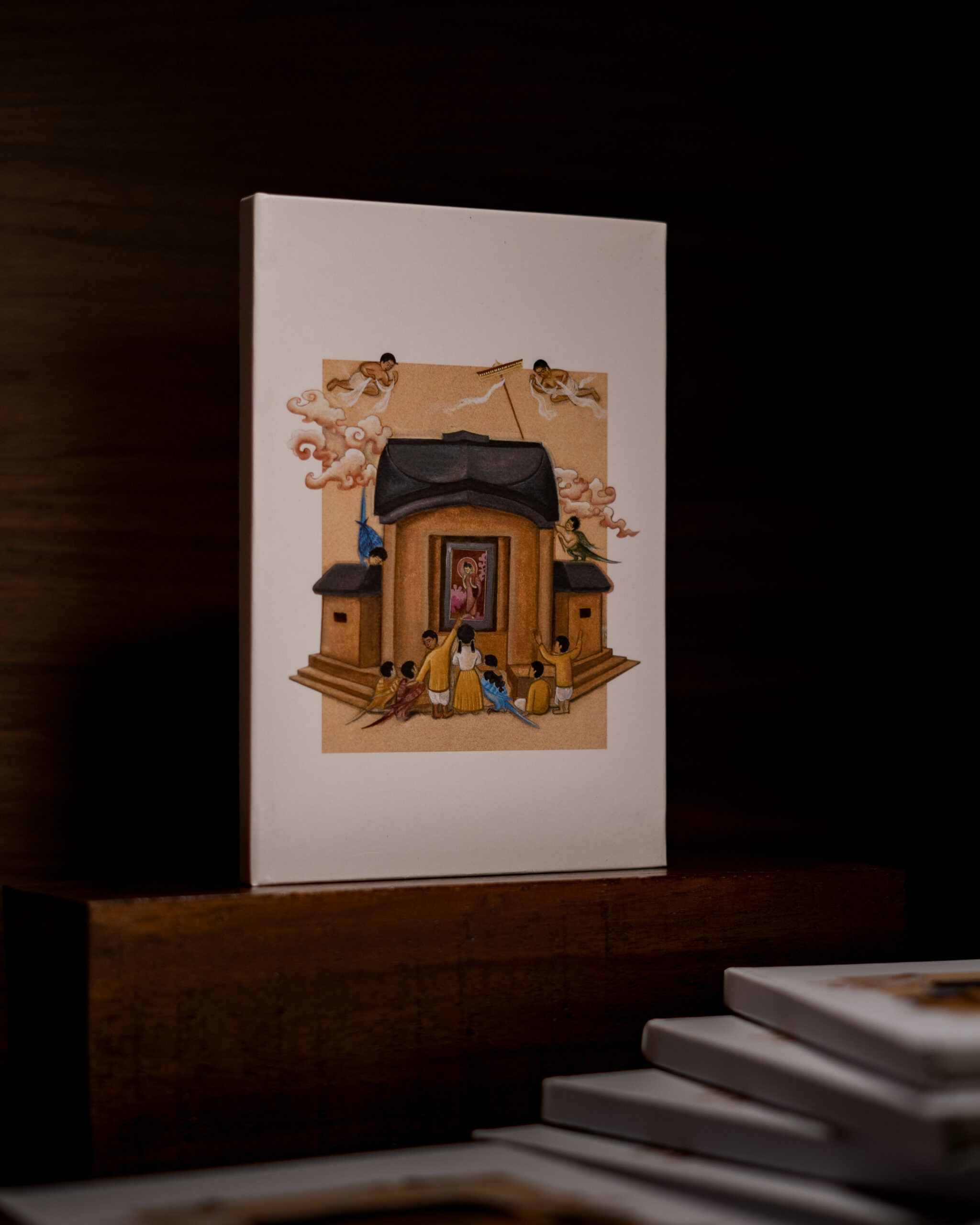 In the warmth of Santiniketan’s Chaiti, the children of Patha Bhavan gather in quiet wonder, admiring a painted image of the Buddha by Mastermoshai Nandalal Bose, glowing like a some divine icon. Around them, kinnaras-half bird, half human-blur the boundaries between the real and the imagined, turning reverence into play. Above, two gandharvas offer muslin in homage as a young kinnara raises a chhatra.