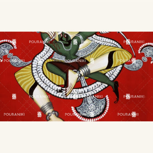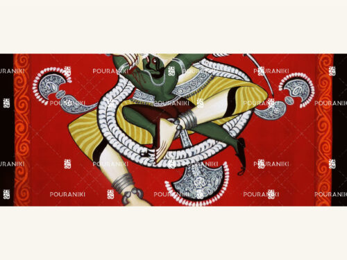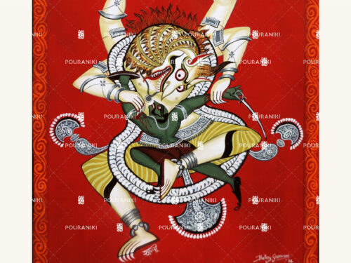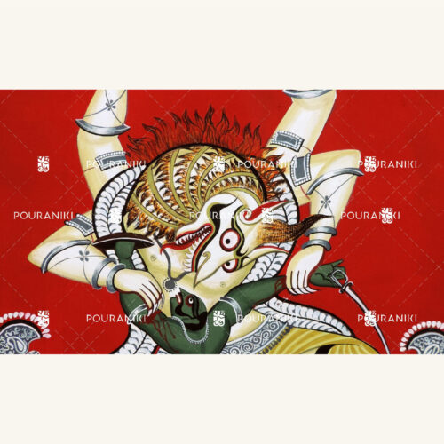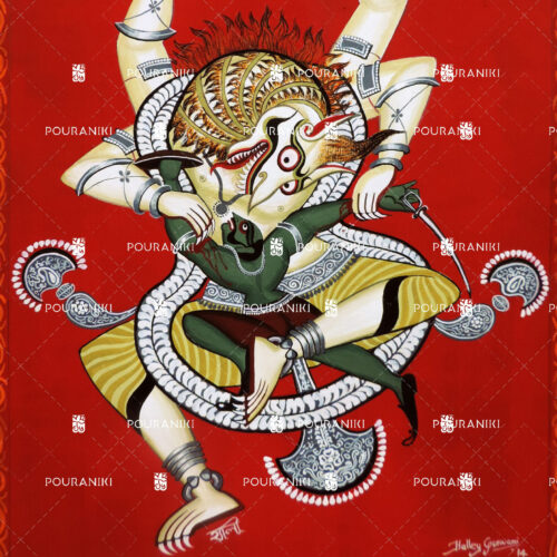 Narasimha is an ancient cult deity of India . Historians believe that his worship began independently and was later absorbed into the pantheon of ‘dasavatars’ . Historically , depictions of Narasimha have varied from region to region . But what is common to all places is the extreme stylized depiction of the lion and his white complexion . Indian art has been a pioneer of ornamentation and stylization . This Narasimha in Bengali style of depiction is based on old manuscript paintings and terracotta temple sculptures but with a modern ferocious twist of its own . Bridging Gauda desha ( Bengal ) of the past with the present .