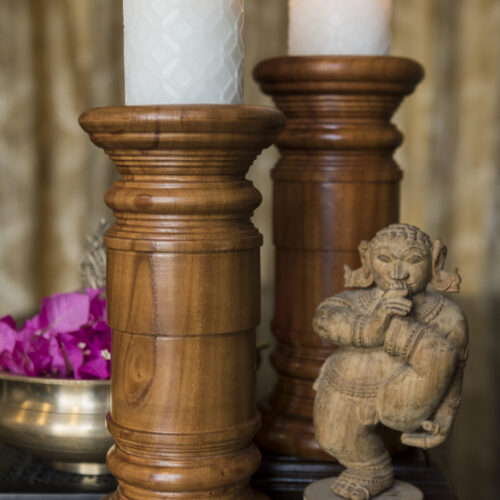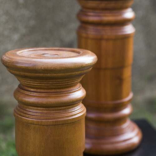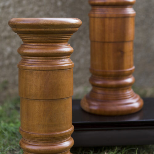 Regal proportions, the iconic cushion capital and ruddy sandstone- all evoked in these candlesticks of solid mahogany.