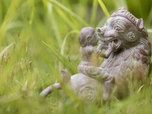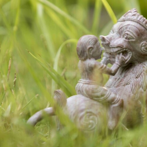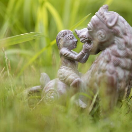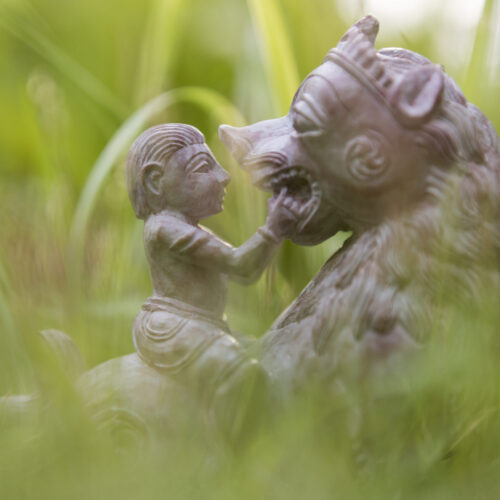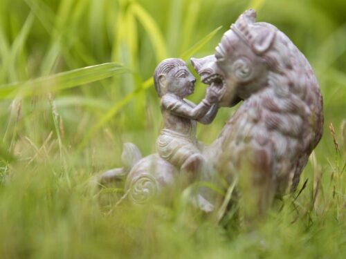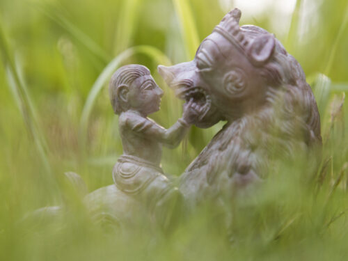 The wondrous moment painted by Kalidasa in his well-loved poetry – a little child playfully opens the mouth of a lion to count his teeth.