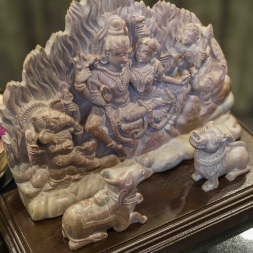 A tranquil depiction of the divine family of Kailash – the abode of truth and bliss. One does not see the great magnificent deities or vanquishers of terrible demons but a tiny intimate family anchored around a loving couple.