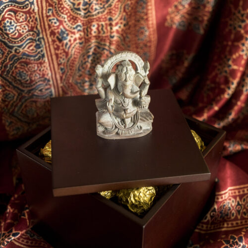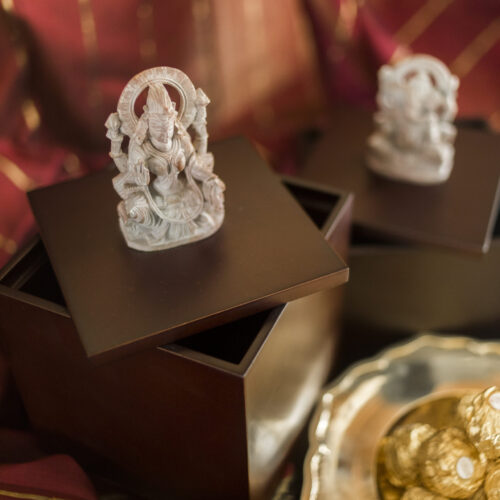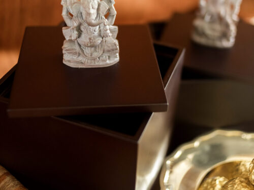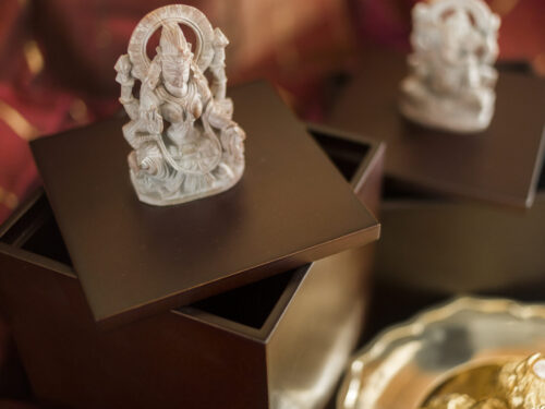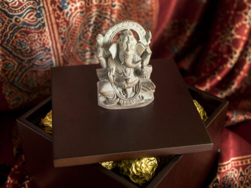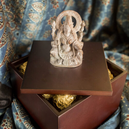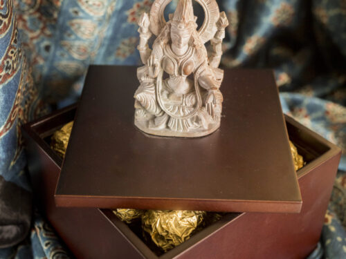 However, the pièce de résistance here is the figural finial on the lid — a beautiful miniature Sri Lakshmi and Lord Ganesh. Deftly carved out with needle point instruments, these icons promise to be guardians of your treasure and fortune.