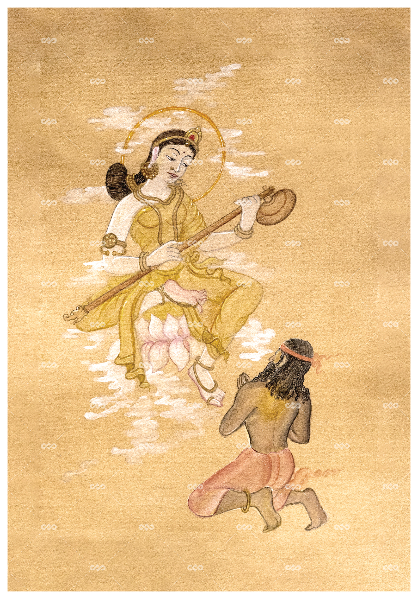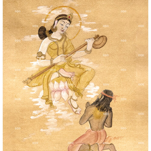 In this divine encounter, his inner shadows begin to recede. The artwork presents the threshold where violence turns to reverence and ignorance softens into understanding-where, through music and the awakening of conscience, Ratnakar transforms into Valmiki.