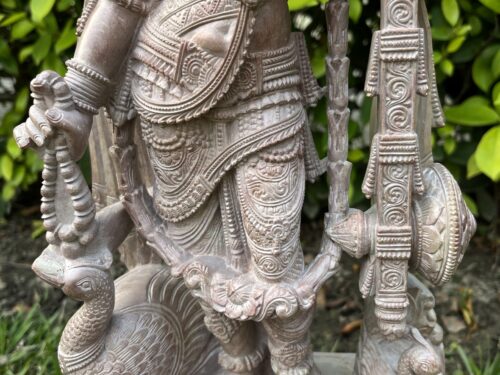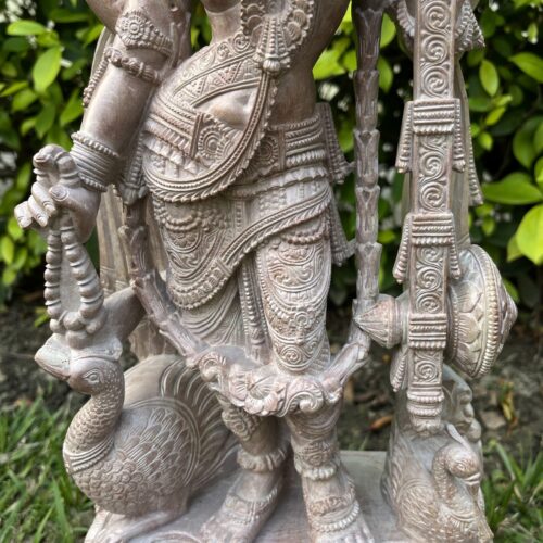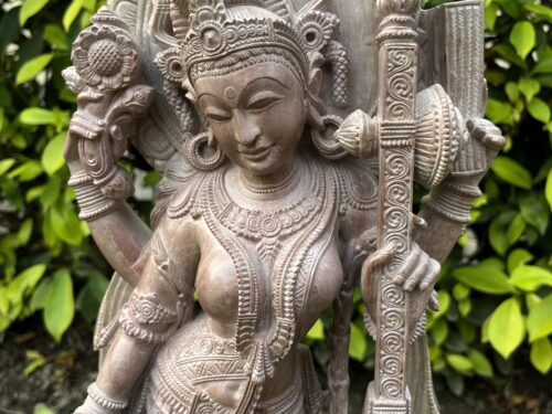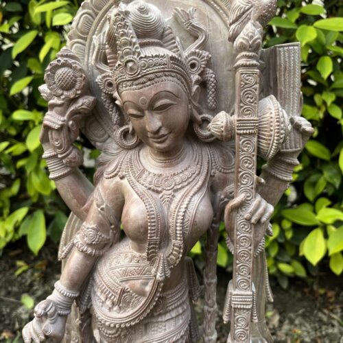 We present a bespoke creation from our studio – the goddess of knowledge, decked in pearls and pristine flowers, gazes benevolently. Exquisite details and layered iconography makes this idol a true treasure. We at KARU pray that the Goddess rests on the brow of every individual and bestows upon all the grace to distinguish the temporal from the eternal.